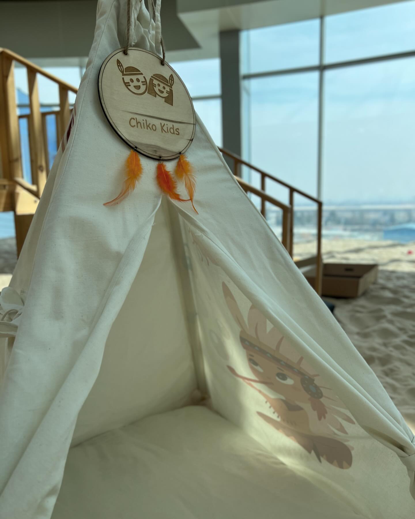 چادر قابل حمل سرخپوستی همراه با تشک که به دلیل وجود چوب های تاشو به راحتی میتوان با خود به باغ و پارک و مسافرت برد،جنس پارچه از متقال و کاملا قابل شستشو میباشد.